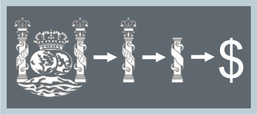 Когда возник знак доллара и кто собственно его придумал? Убедительного ответа до сих пор не имеется. По официальной версии доллар произошел от испанского песо. Пометили его буквой «P». Много денег помечали буковкой «S». В дальнейшем это обозначение упростили торгаши: они решили наложить одну на другую буквы, обретя при этом красивый вид знака. Изображение двух вертикальных палочек образовалось от двух колонн, являющихся символом Гибралтарских столбов нарисованных на испанской валюте.
