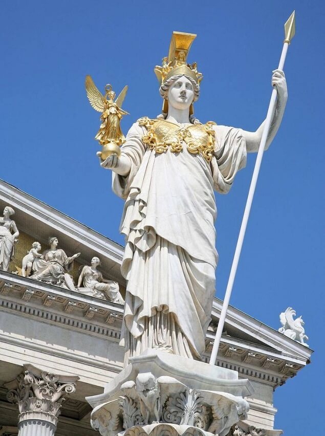 Среди дюжины богов Олимпа - три женщины: Гера, Афродита и самая почитаемая — Афина. Согласно мифу, она появилась из головы Зевса прямо в военной экипировке. Поэтому греки считали ее богиней войны, а еще покровительницей искусства и ремесла. Защищала города и страны, мореплавателей и строителей кораблей. Была умна и изобретательна. Женщины почитали Афину как наставницу и целительницу. Афину изображали классической красавицей. Она была высокого роста, стройной, с русыми волосами, большими глазами небесного цвета. Но всегда одетой в доспехи. У ног богини была сова или змея, символы мудрости. В одной руке она держала крошеную скульптурку Ники, которая олицетворяла Победу. Историки утверждают, что после создания фигуры Афины в символах некоторых государств появились изображения женщины.