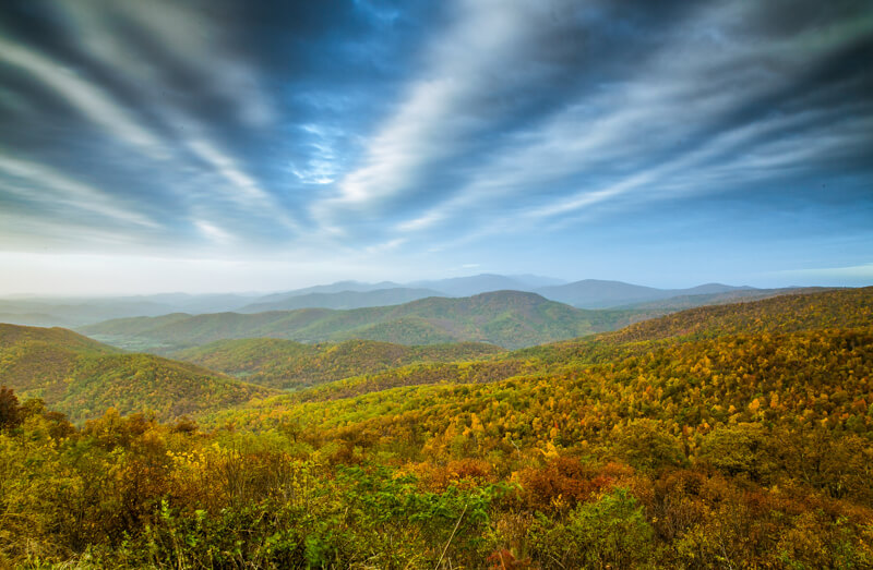 Шенандоа - защищенная часть Голубого хребта всего лишь в 100 км от Вашингтона. Удобное расположение означает, что этот парк хорошо финансируется (рестораны, кемпинги, маршруты) и здесь может быть весьма многолюдно. Здесь проходит Скайлайн драйв, автомобильный маршрут, пользующийся большой популярностью.