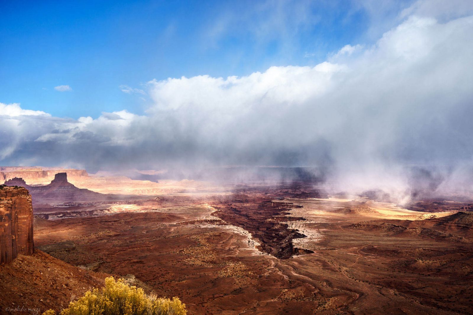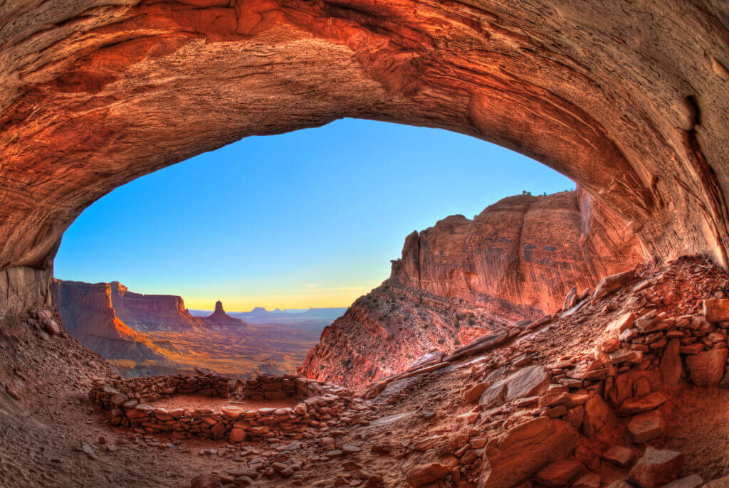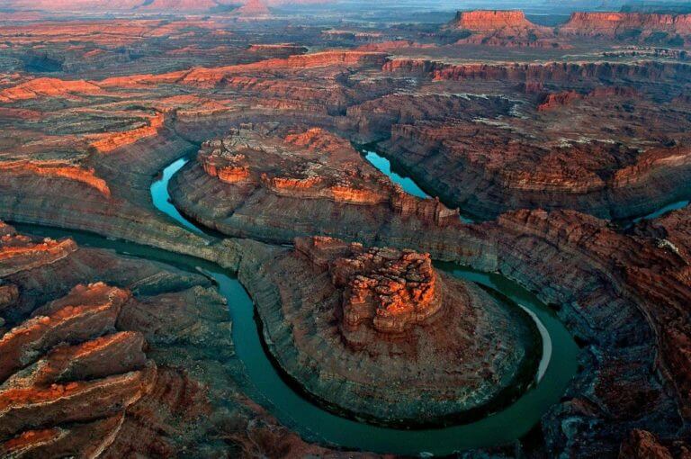 Река Колорадо красива не только в районе Гранд-Каньона. В южной части штата Юта водные потоки этой реки вырезали величественные красные ущелья, холмы и вершины, которые создают неповторимый ландшафт национального парка Каньонлендс.